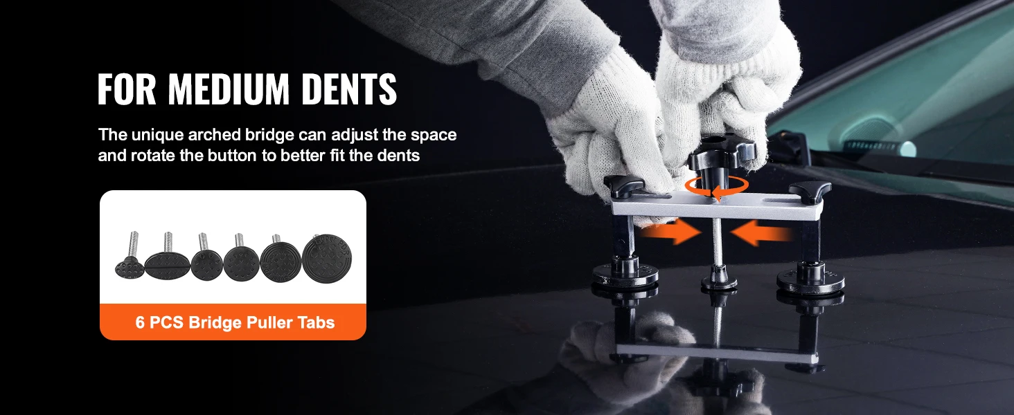 Professional Dent Puller Kit: Our golden dent lifter allows you to adjust the width and height to accommodate different dent size from 0.2" to 5.3". And the bridge dent puller can also be adjusted to repair dents from 0.2" to 3.54". The stainless steel 2-in-1 slide hammer can be used as a short one or a long one with a simple replacement. Three suction cups are quite easy to use, make dents disappear from your beloved car.