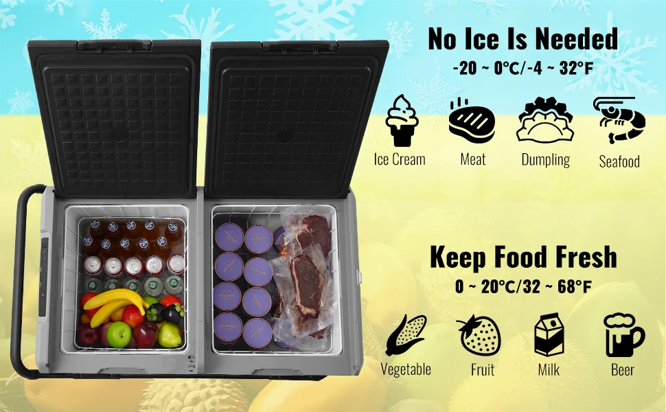 LED Screen & Bluetooth Control: The LED control panel allows you to directly view the operation status of the car fridge and adjust the temperature range at any time. You can set any temperature between -20°C to 20°C / -4°F to 68°F on the panel. The electric cooler also features Bluetooth mode, connecting to a mobile app for remote control. Both zones can be used separately as freezer or refrigerator.