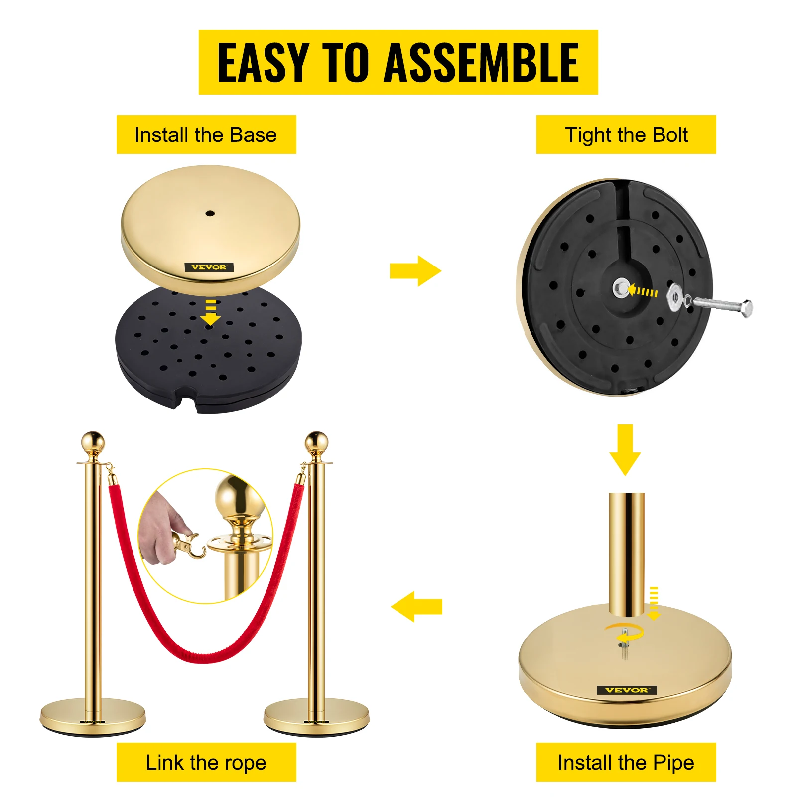 • Durable Material: The gold crowd control stanchions are constructed by 201 stainless steel post and zinc alloy ball, which is durable and not afraid of high temperature. Moreover, this durable material features waterproof and rustproof to adapt to indoor and outside.