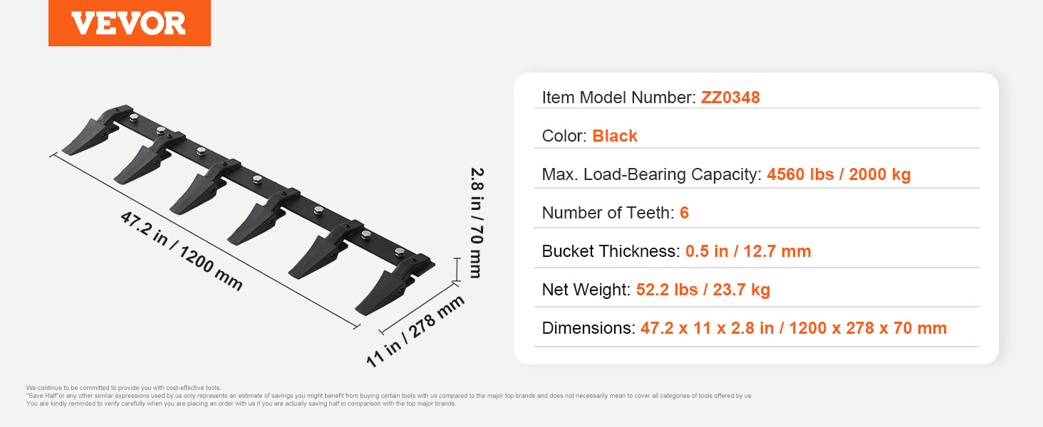 Compared with most flat bucket tooth bar, our curved shank is designed to fit the digging bucket, each tooth bar is subdivided into two for double the efficiency and half the effort in digging tasks. With 4560 lbs load capacity to breeze through the toughest digging and transporting jobs.