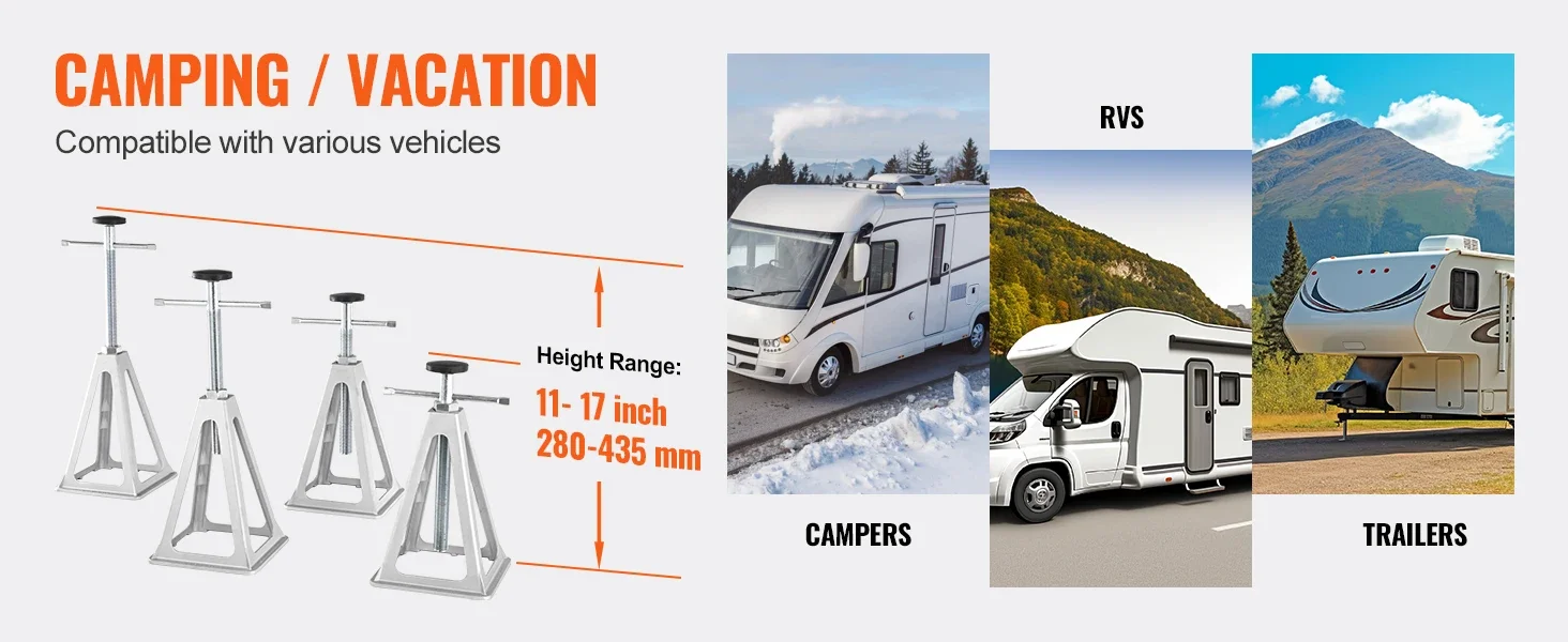 Our adjustable RV jack stands are not just limited to RVs; they can also be used for trailers and campers. No matter what type of vehicle you have, our versatile jacks can effortlessly cater to your unique needs.