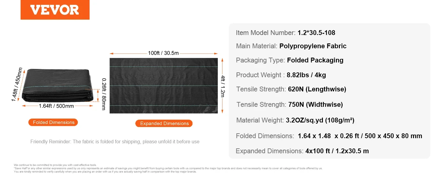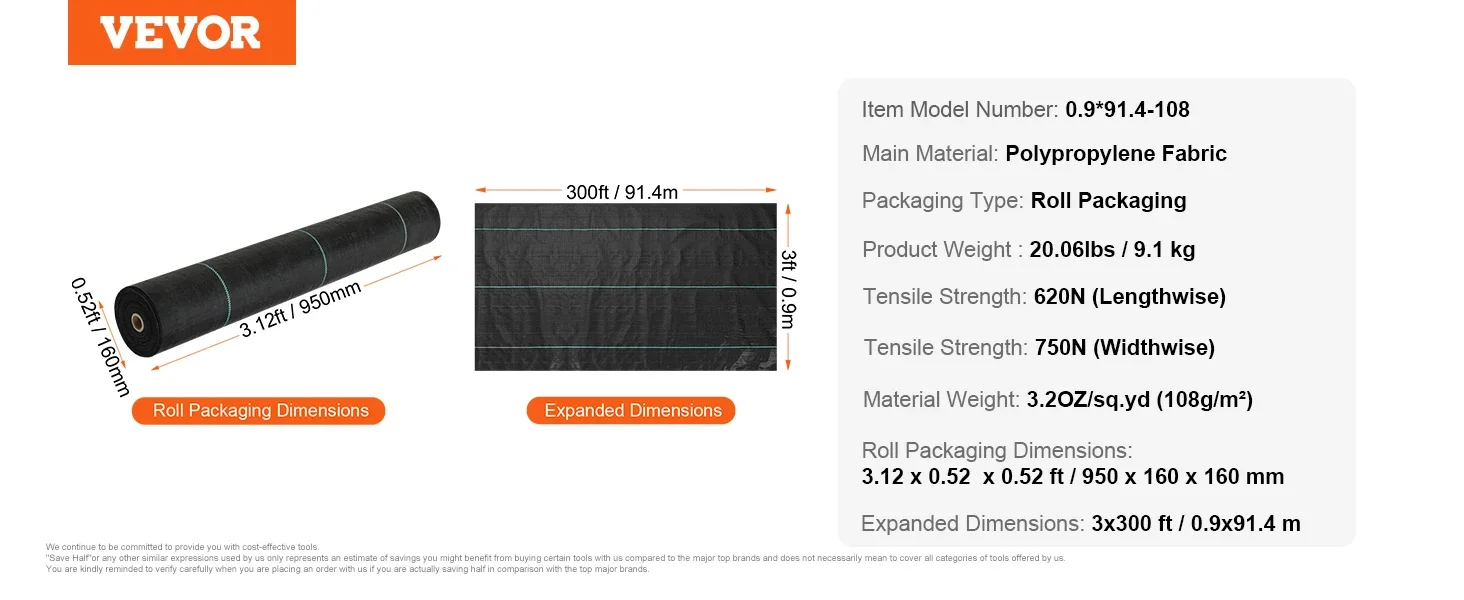 Heavy Duty Weed Barrier Fabric: Crafted from 3OZ high-density, tear and corrosion resistant polypropylene, VEVOR 6 x 300FT woven weed barrier landscape fabric is the preferred choice for agriculture and industry. It ensures superior weed prevention and promotes soil health, keeping your landscaping remain weed-free for an extended period.