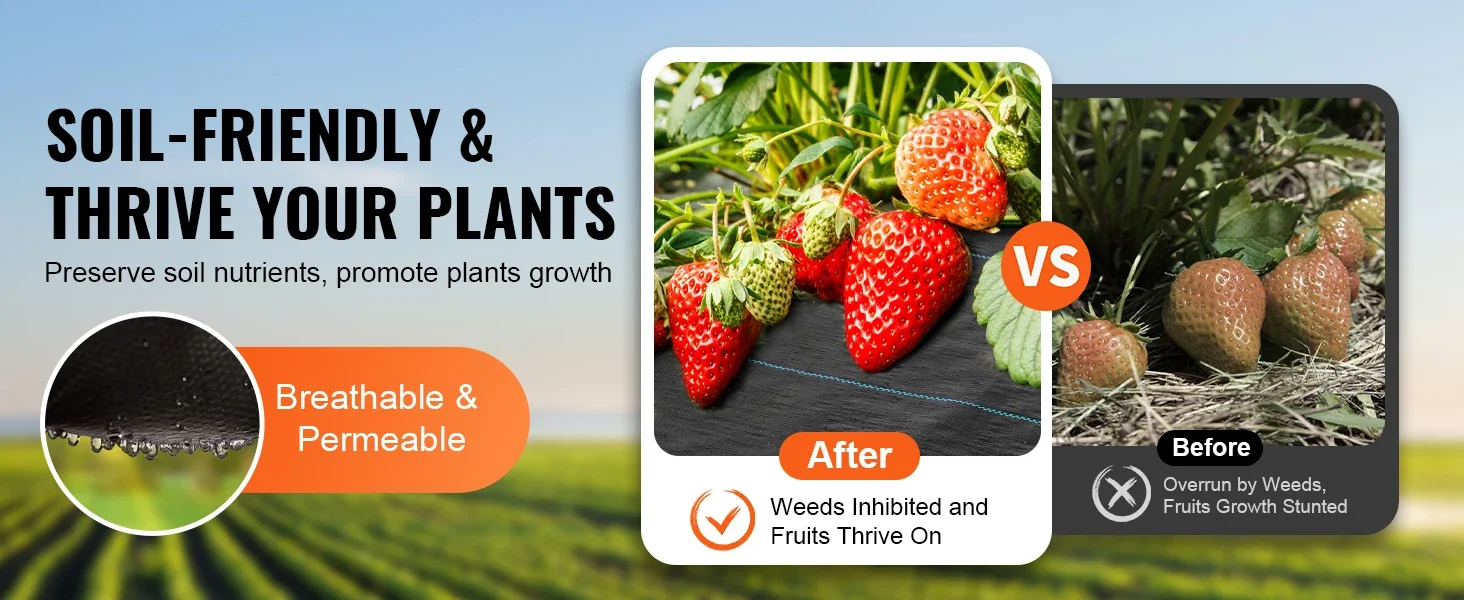 Soil-Friendly and Highly Permeable: VEVOR landscaping fabric stands out with its exceptional permeability and breathability. It allows water and air to pass through freely, promoting plants breathing and locking in soil nutrients. Say goodbye to water loss and soil erosion, let your plants thrive in the healthy environment.