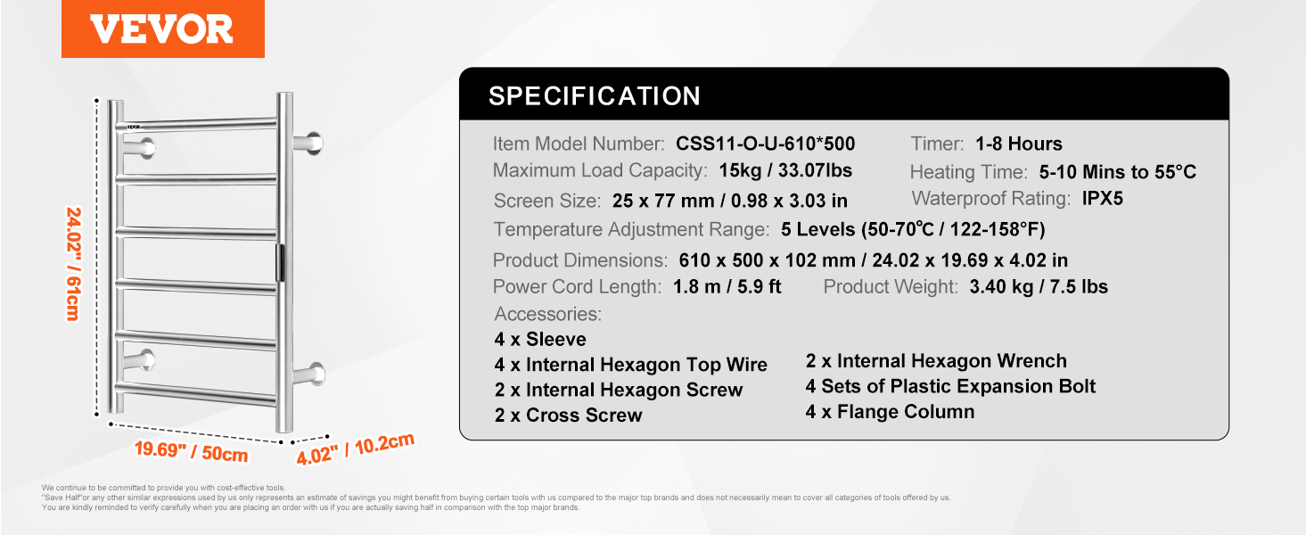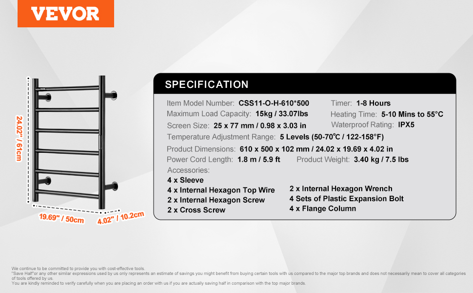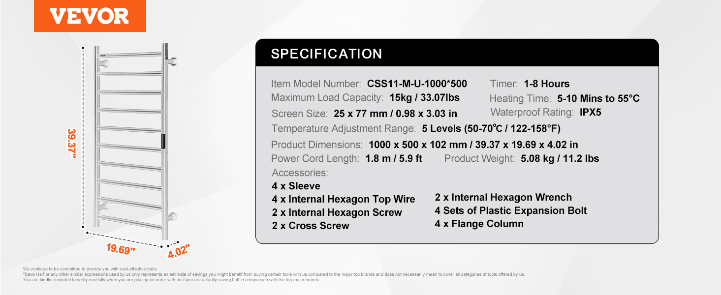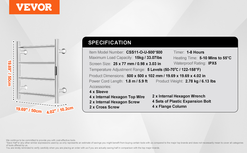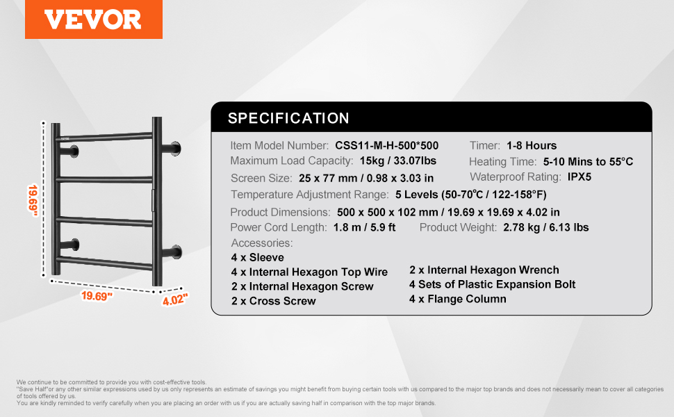 Constructed from stainless steel, the towel warmer features a robust frame and IPX5 waterproof rating, ensuring excellent performance.
