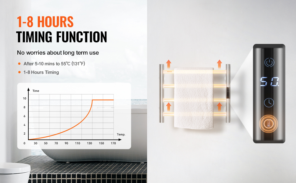 • Smart Timer: The heated towel rack comes with a built-in timer, allowing you to set heating times from 1 to 8 hours according to your needs. This feature eliminates safety concerns associated with prolonged use and saves you time and effort.