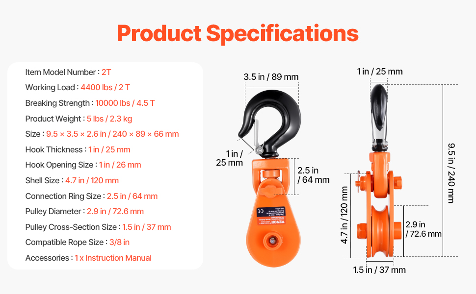 Built to Last: Made from high-quality alloy steel, this snatch block with hook is tough and durable. The pulley accommodates 3/8 inch rope, and its groove design keeps the rope securely in place, reducing the risk of slippage while ensuring stable and secure lifting.