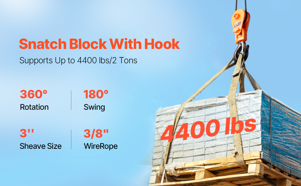 Tackle Any Environment: With a 180° swinging lifting ring, this snatch block pulley lets you adjust the pulling angle to fit any job. Whether you're in tight spaces or need extra flexibility, it makes lifting easier and more efficient in challenging environments.
