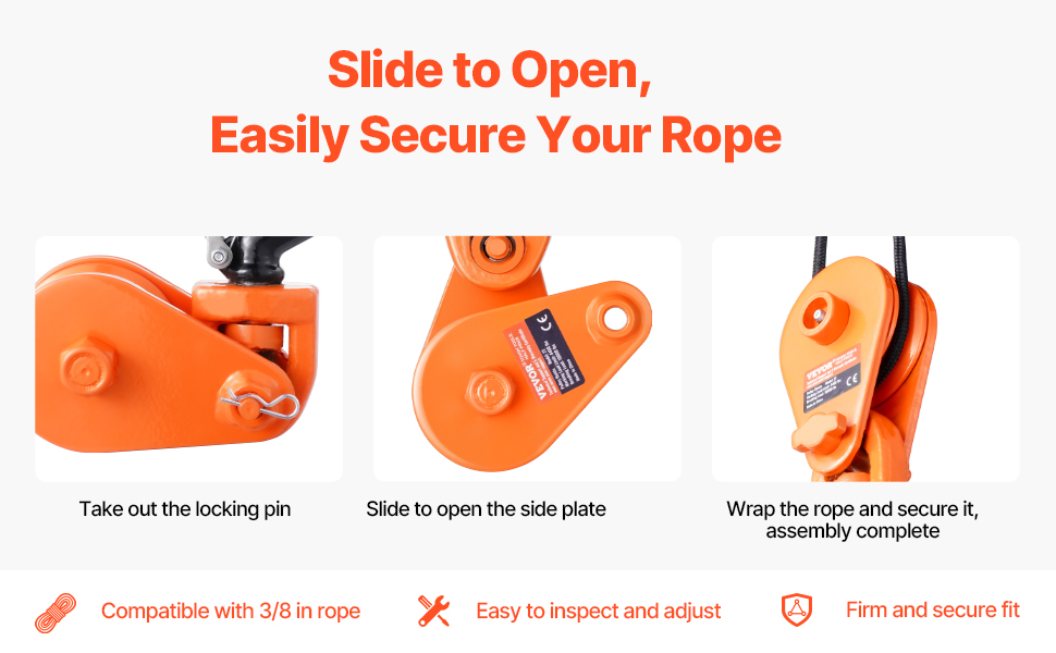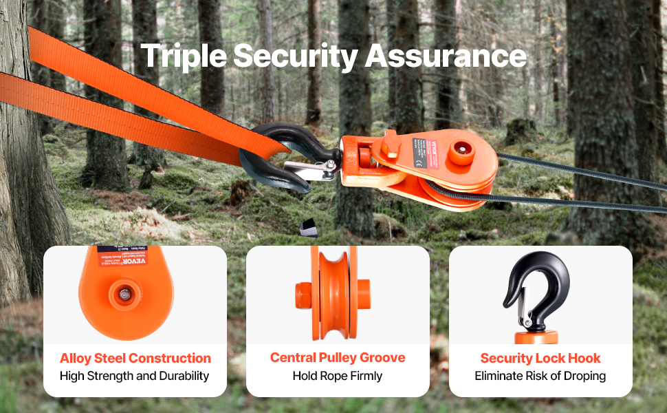 Easy to Use: The side panel of the pulley block is secured with a security pin for easy opening. Just slide it open, feed in your rope, and you’re ready to lift—no need to struggle with threading the cable through the pulley. It’s quick and easy, ideal for one-person operation.