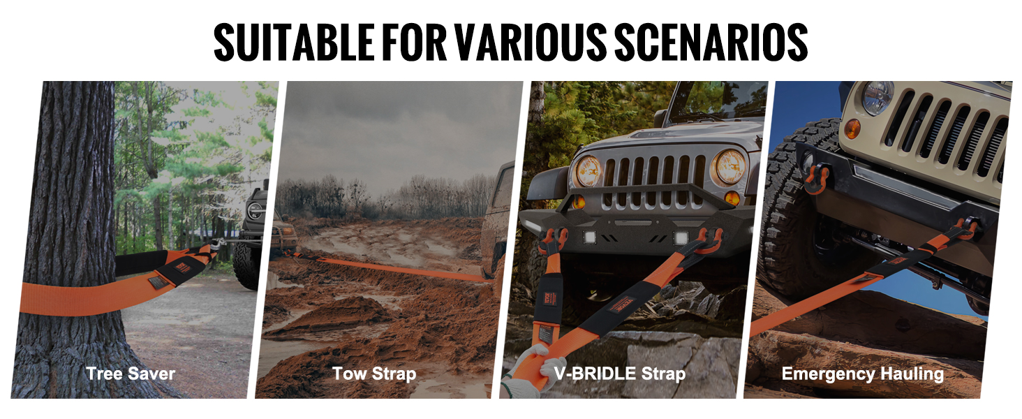 Heavy-Duty Vehicle Tow Strap: Our tow strap is a 3/4/2-inch wide, 8/30/20-foot long powerhouse boasting a robust 36,000/46,500 lbs capacity. With strong UV protection and top-notch durability, it's your trusty companion for pulling vehicles out of tight spots in extreme outdoor conditions, providing reliable rescue support. It's an essential tool for off-roaders, emergency personnel, farmers, or anyone needing to tow heavy loads.