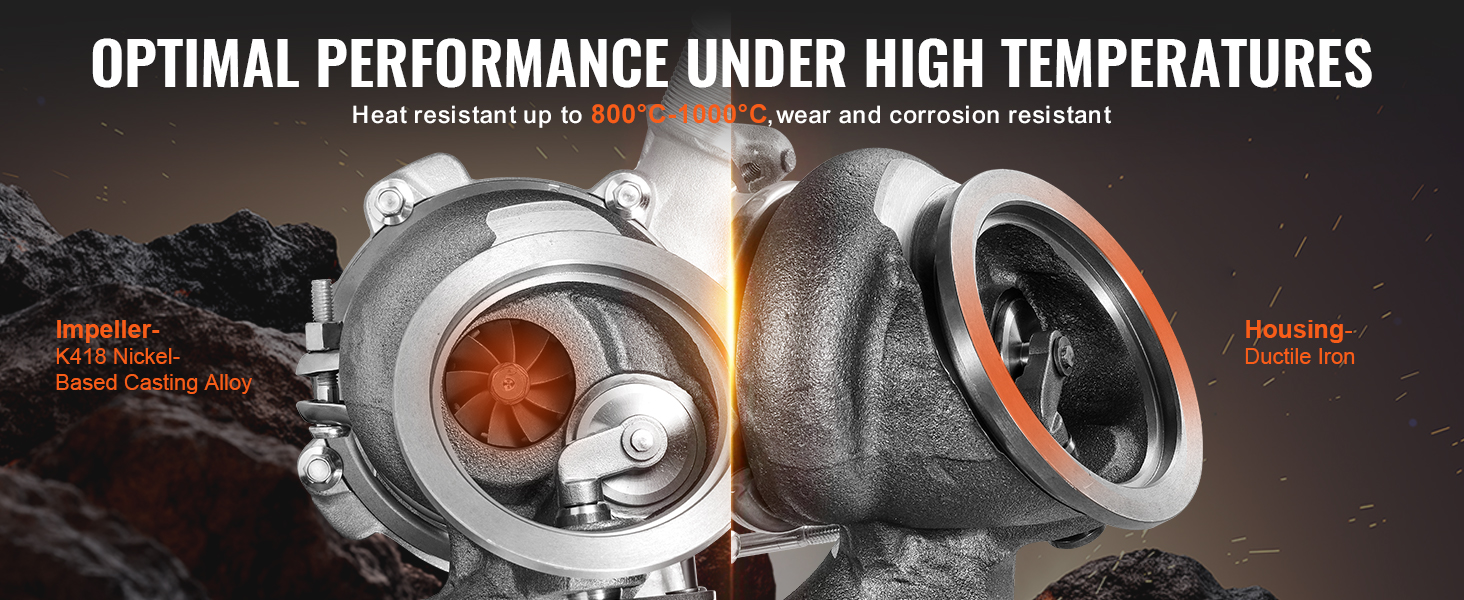 Heat Resistance Materials: The turbo turbocharger features a ductile iron housing and a K418 nickel-based cast alloy impeller, capable of withstanding temperatures up to 800-1000℃. This ensures reliable performance and stability even under extreme temperatures.