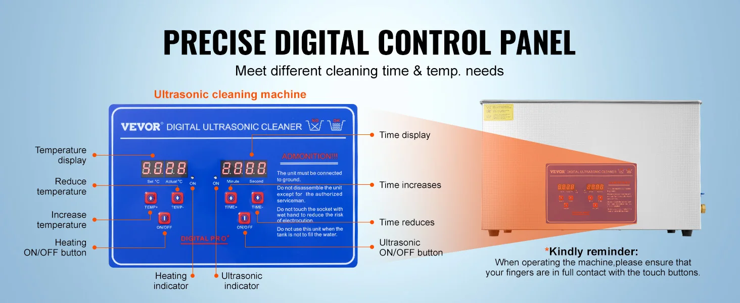 The digital control panel offers convenient operation, allowing you to precisely adjust cleaning time and temperature according to the specific requirements of different items, maximizing cleaning effectiveness.