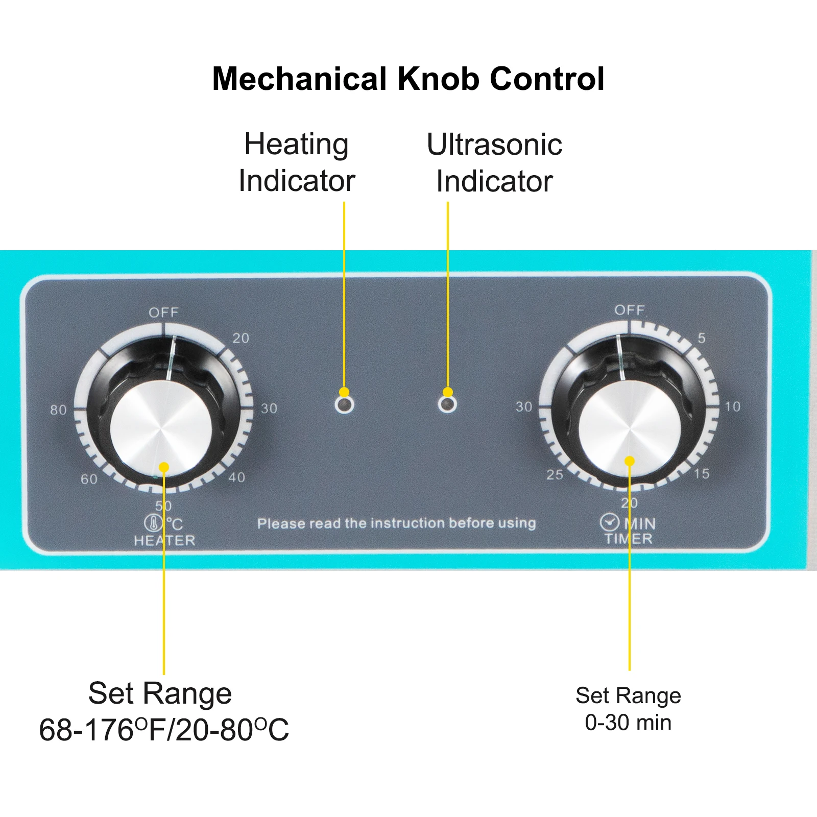 【MECHANICAL KNOB CONTROL】 - The jewelry cleaner ultrasonic machine features two mechanical knobs to adjust functions, with an adjustable timer (0-30 min) and heater (68-176℉/20-80℃). A heating function can effectively soften and dissolve stubborn marks, thereby improving the cleaning effect.