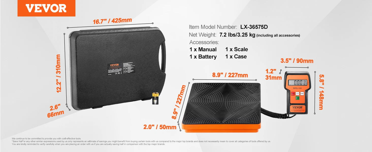 Portable Design: Housed in a waterproof and dustproof plastic case for safe transport and storage. The case's buckle design prevents accidental openings, ensuring the refrigerant scale and remote control are securely stored. Ideal for on-the-go professionals requiring reliable measurement tools.