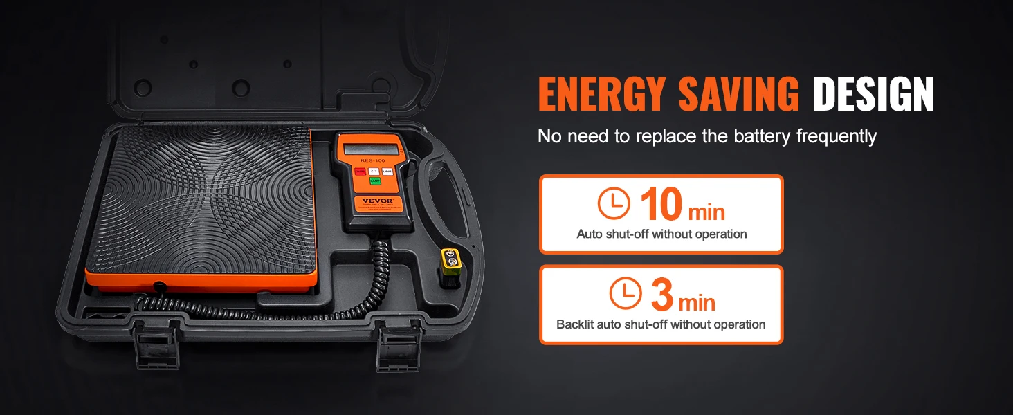 Ready-to-Use with Included Dry Battery: The HVAC refrigerant scale comes with a DV 9V dry battery for immediate use. Intelligent energy-saving features include an automatic shutdown after 10 minutes of inactivity and a backlight that turns off after 3 minutes without operation, extending battery life. For maintenance, remove the battery if not in use for extended periods to prevent damage.