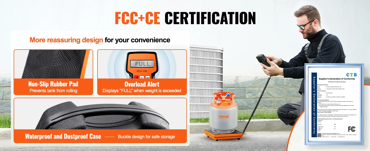 FCC+CE Certification: Boasts FCC and CE certifications for enhanced safety. Our hvac scale includes non-slip rubber pads for a stable weighing platform, reducing the risk of the recycling tank rolling or sliding. Features a "FULL" load indicator for overload protection, preserving the scale's longevity.