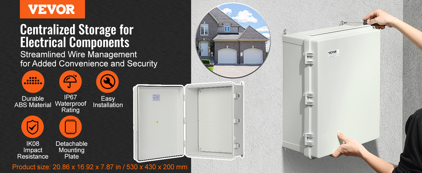 • 530 x 430 x 200 mm——Our ABS electrical junction box boasts external dimensions of 20.87 x 16.92 x 7.87 in/530 x 430 x 200 mm and internal dimensions of 19.01 x 15.08 x 7.12 in/483 x 383 x 181 mm, providing ample space for easy wiring. Elevate your electrical component storage with our electrical enclosure box!