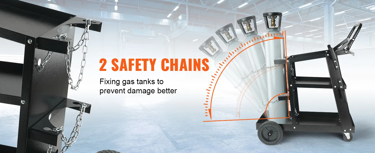 Secure Gas Cylinder Placement: Our anti-toppling plasma cutter welding cart ensures reliable and secure placement of gas cylinders. It features 2 gas cylinder slots and 2 stainless steel safety chains, effectively preventing cylinder slippage. Perfectly suitable for oxygen cylinders, acetylene cylinders, nitrogen cylinders, liquefied gas cylinders, and more. Keep your gas cylinders remain stable and safe during transport and welding works.