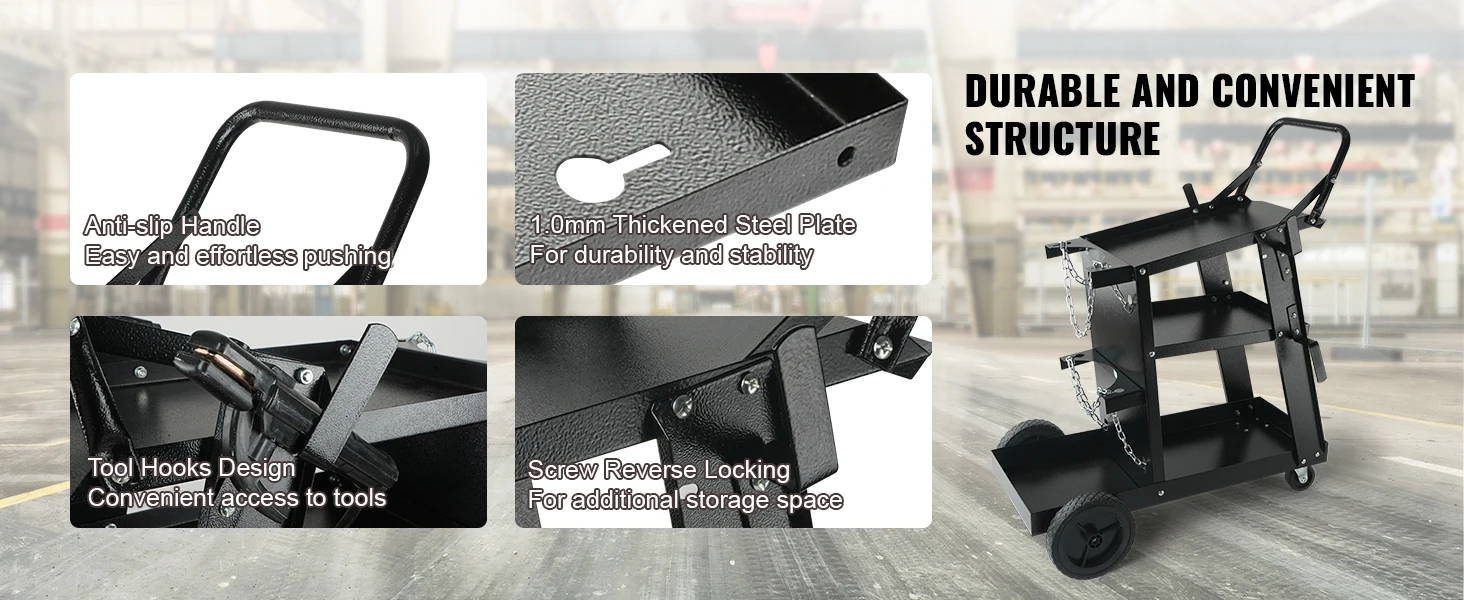 Your Excellent Storage Assistant: Large 3-tier MIG welder cart features a narrow top and a wide bottom, effortlessly accommodating welding caps, welding machines, gas cylinders, welding guns, tools, and more. 4 multi-functional brackets on the sides can hold welding guns, welding pliers, and other tools. Keep your welding tool within arm's reach and well tidy your space with VEVOR.