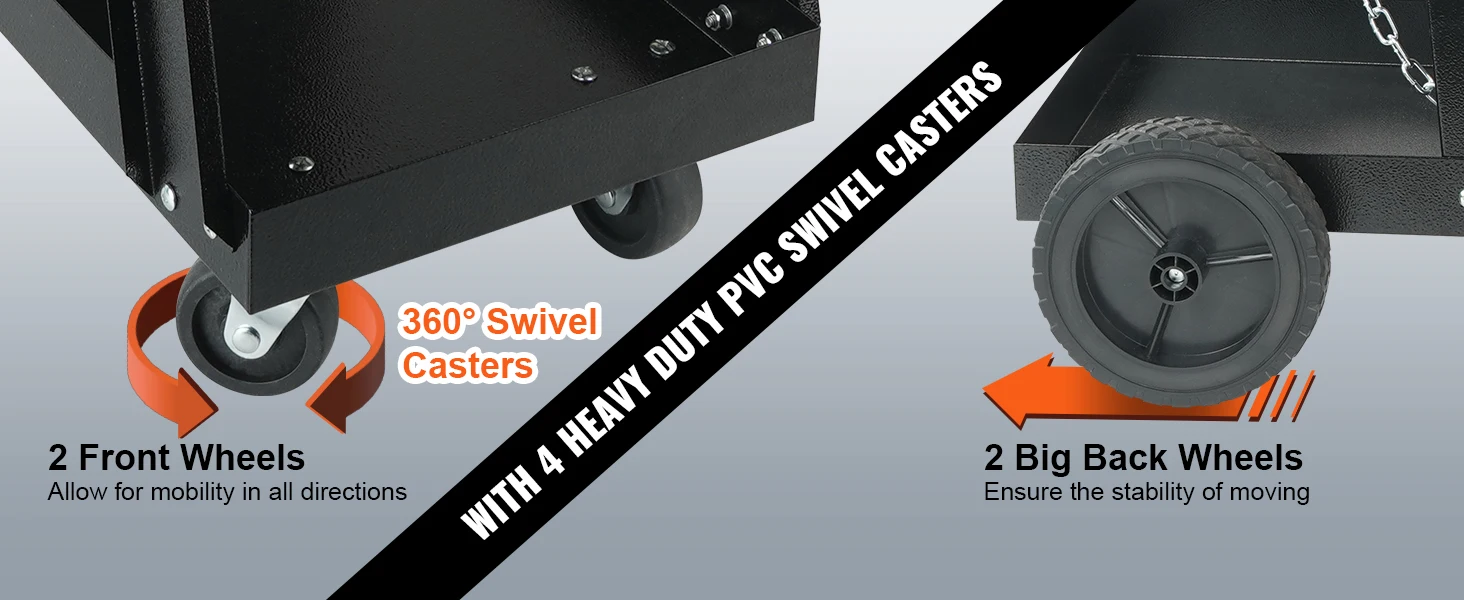 A Practical Tool for Welding: Two 2.9-inch (7.2cm) front swivel casters support 360-degree flexible rotation, and two 7-inch (17.5cm) large rear casters ensure the stability of moving especially with heavy loads. High-quality PVC wheels can absorb shock, provide silent operation without floor scratches. Anti-slip handle makes pushing and pulling labor-saving. Adjustable inclined top shelf ensures the safety of each welding machine at all times by adjusting the center.