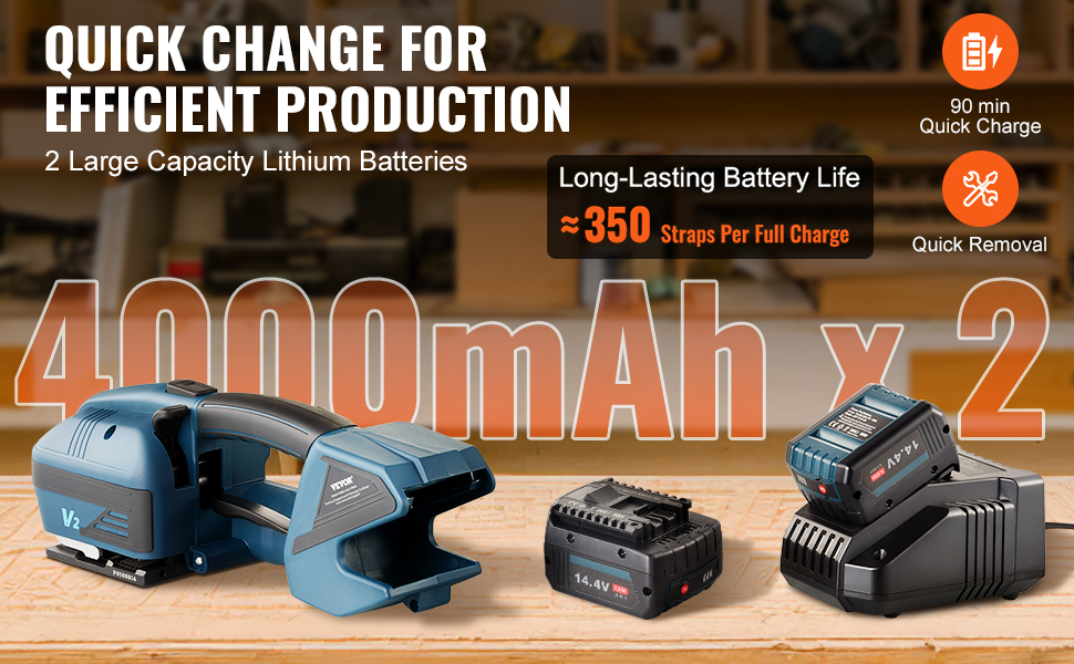 Large Battery for Efficient Production: Powered by two 4000mAh lithium batteries, this electric banding tool lets you strap up to 350 times on a full charge. It charges quickly in just 90 minutes and has a detachable design, so you can swap batteries on the go. Less downtime means more productivity and less hassle for you.