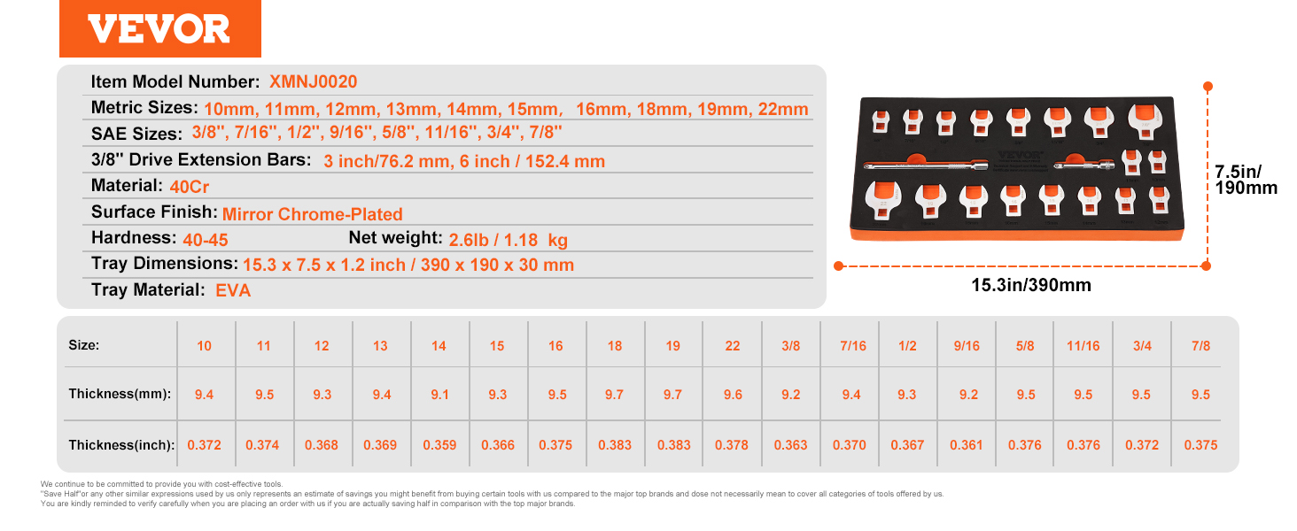 • 15PCs Diverse Specifications:In different repair scenarios, various tool sizes are required. Our crowfoot wrench set gathers 3/8" drive sizes 8mm, 9mm, 10mm, 11mm, 12mm, 13mm, 14mm, 15mm, 16mm, 17mm, 18mm, and 19 mm, totaling 12 pieces, and 1/2" drive sizes: 21mm, 22mm, and 24mm, totaling 3 pieces. This ensures you can handle different fasteners and bolts effortlessly, making you well-equipped for various tasks.