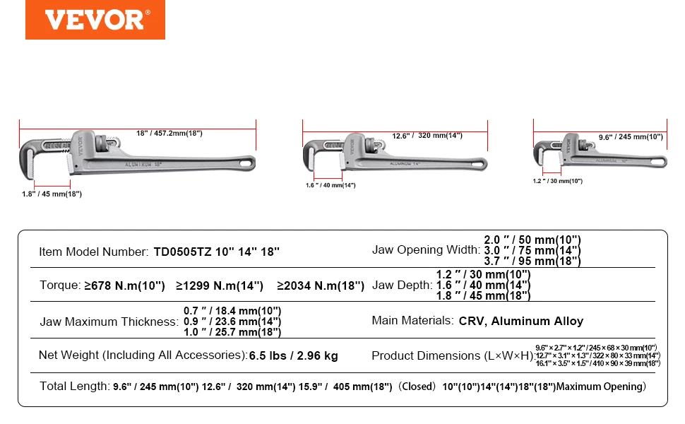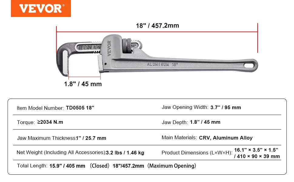 • Ergonomic Design: H-shaped handle design of the aluminum straight pipe wrench provides excellent weight distribution for easier handling and increased torque, allowing you to work more efficiently without excessive fatigue.