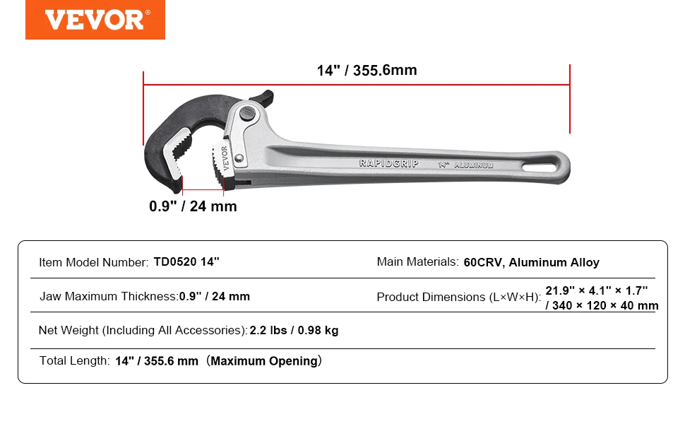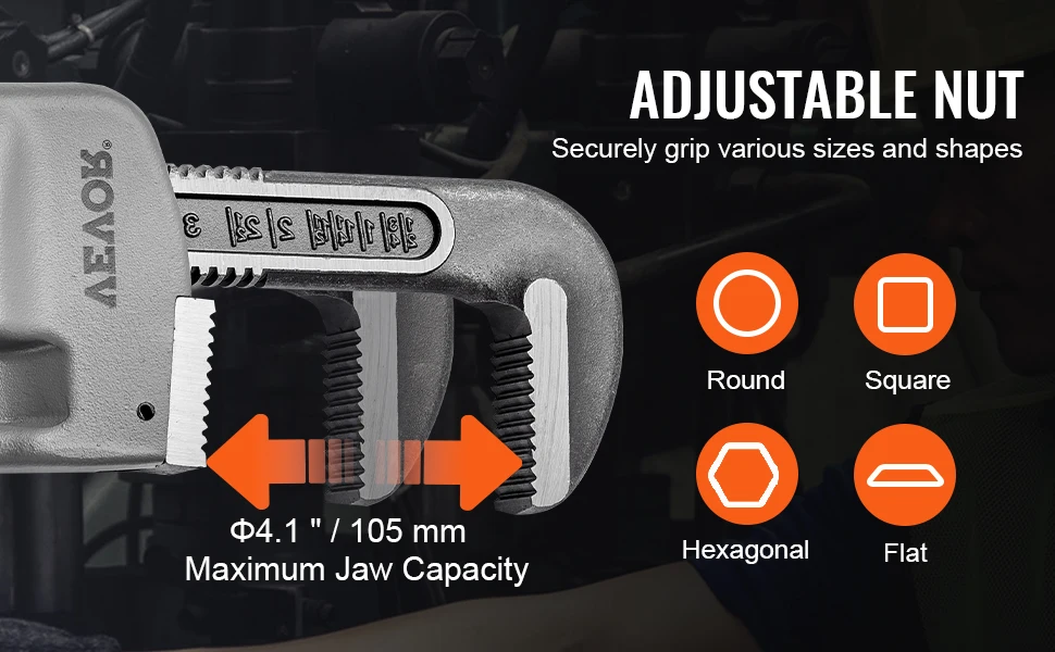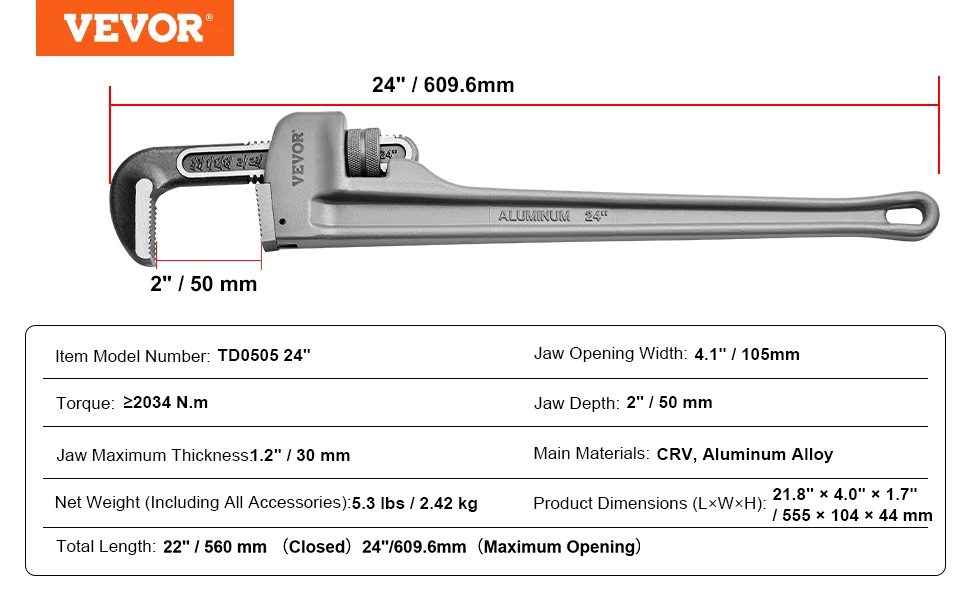 • Wide Application: The 24" plumbing wrench grips pipes up to 4.1" / 105mm in diameter, suitable for tasks requiring fastening, loosening, or adjusting threaded connections in mechanical manufacturing, automotive repair, construction, and plumbing.