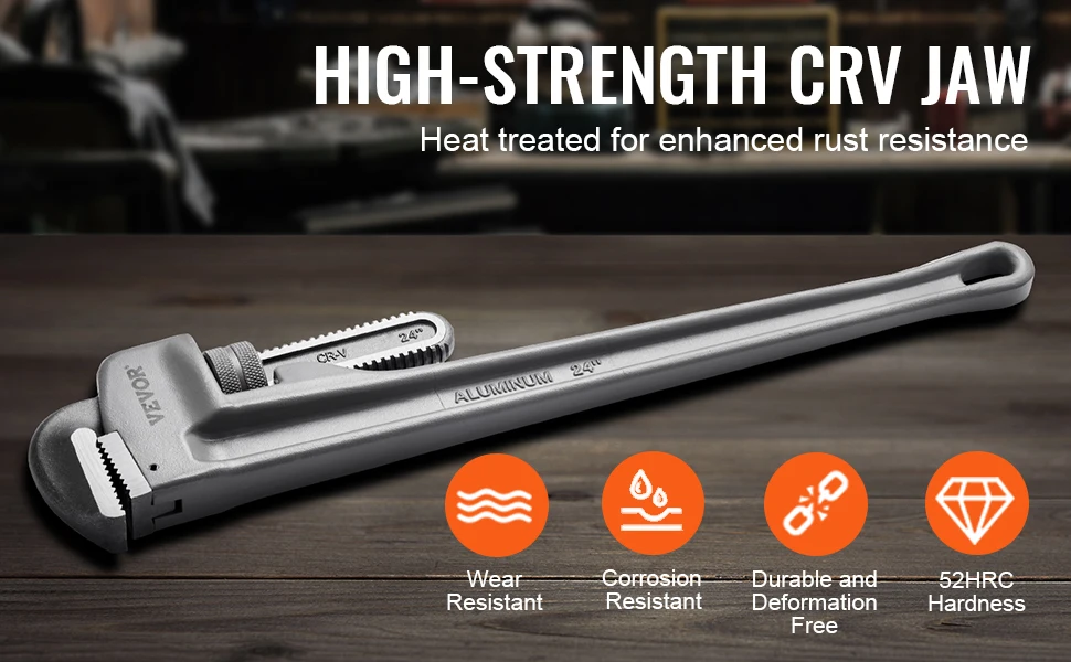 Chromium-vanadium steel provides excellent strength and hardness, resisting long-term wear and corrosion. Our aluminum pipe wrench performs reliably even in humid or harsh environments without rusting.